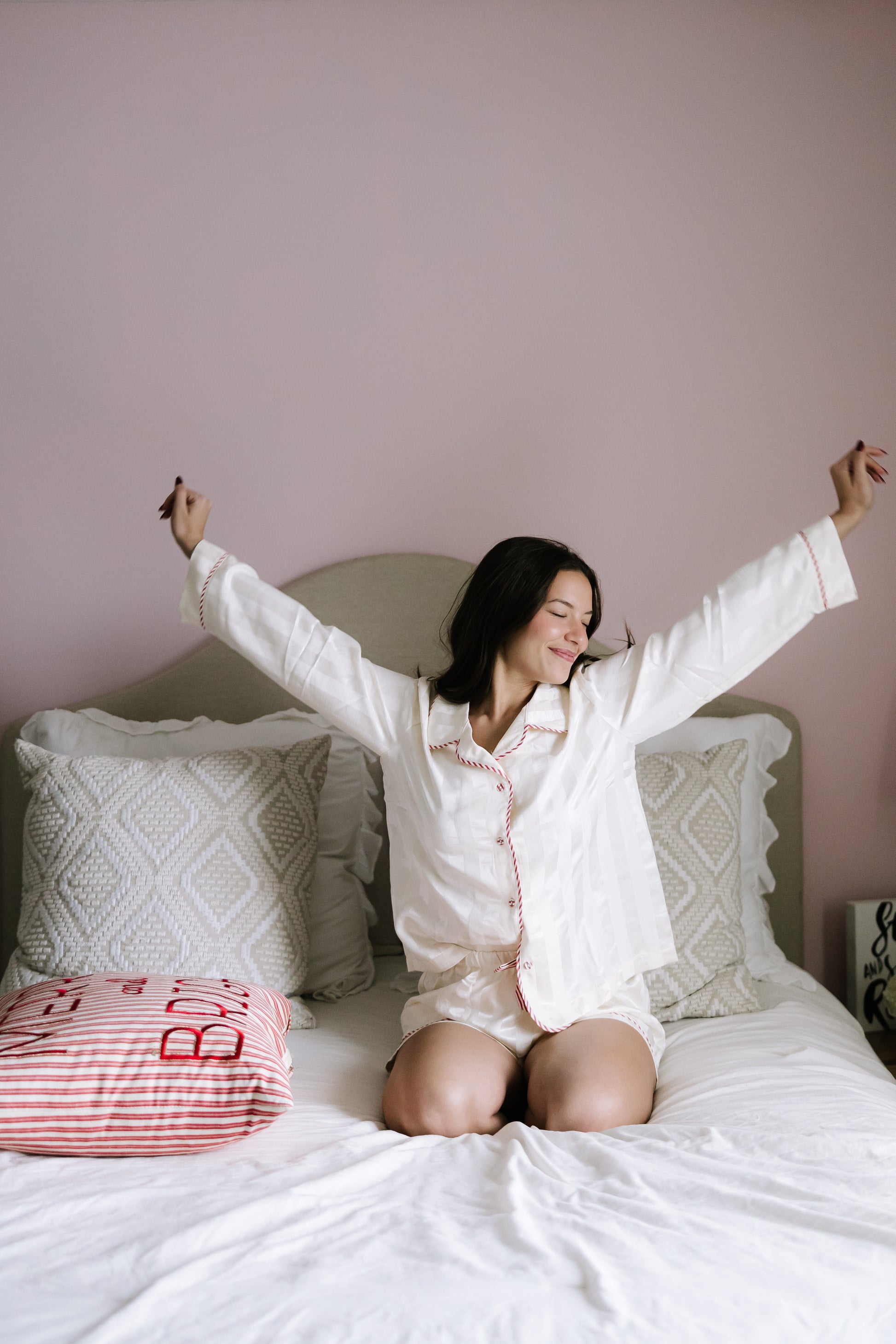 This Cream Christmas Pajama Set is crafted from a soft, lightweight fabric with subtle satin-like sheen and vertical texturing for an elevated feel. The button-down top features red candy-cane piping along the collar and cuffs, while the matching shorts include a festive striped ribbon bow at the waist. Perfect for holiday mornings, matching family photos, or gifting to your favorite cozy girl.