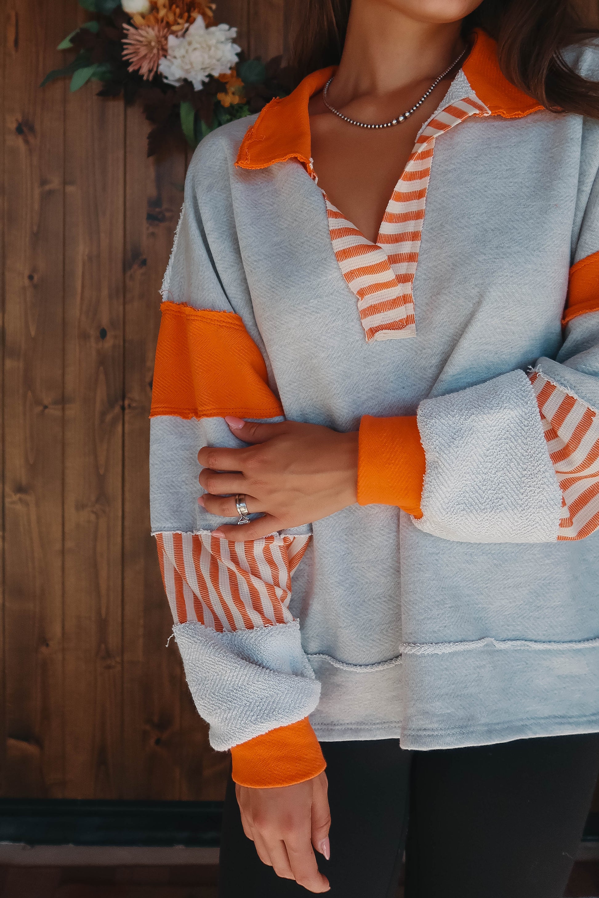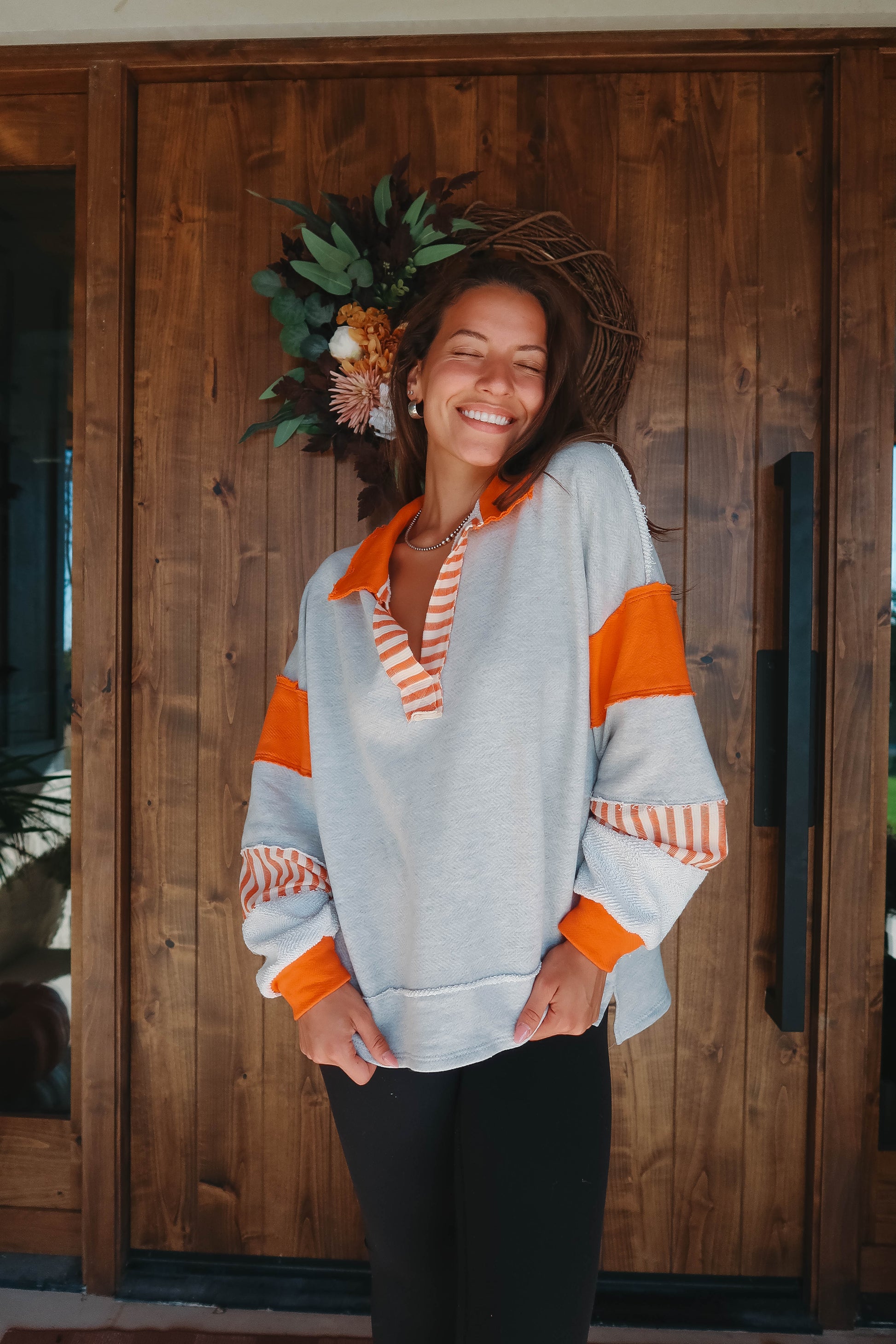 The perfect cozy yet chic pullover to wear all season long! This pullover features a contrast collared v-neckline, drop shoulder detail on long sleeves, ribbed cuffs, stitched details, oversized, and a ribbed hem. Grab this pullover to wear in class, or a chilly fall day!